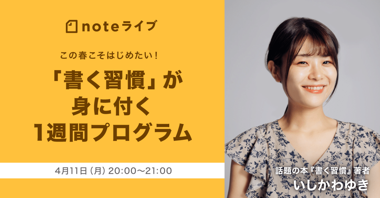 今年の春こそ、書く習慣を身につけたい! そんな方に向けて、『書く習慣 〜自分と人生が変わるいちばん大切な文章力〜』の著者でライターのいしかわゆきさんを講師としてお迎えし、1週間プログラムを開催します。
